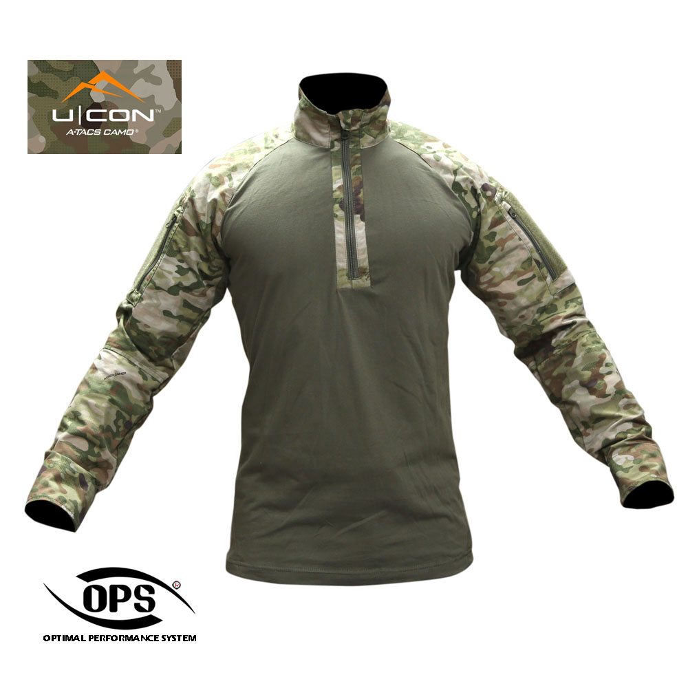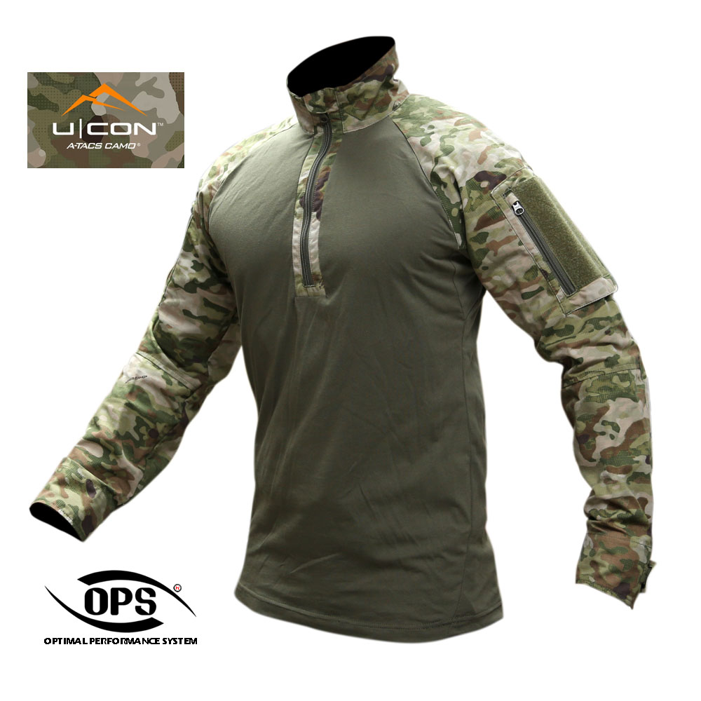 | -A-TACS FG-X, AU-X | -ORIGINAL/MIL-SPEC 50/50 NYCO RIPSTOP(SLEEVES, COLLAR)-ORIGINAL CORDURA BRAND 55/45 NYCO EXTREME RIP-STOP (SLEEVES, COLLAR). -ORIGINAL 100% COTTON JERSEY(TORSO). -SYNTHETIC 2 WAY STRETCH FABRIC(ARMPIT),(23% NYLON, 73% RAYON, 4%SPANDEX,) -ORIGINAL/MIL-SPEC 500D(ELBOW POCKET/REINFORCEMENT). |